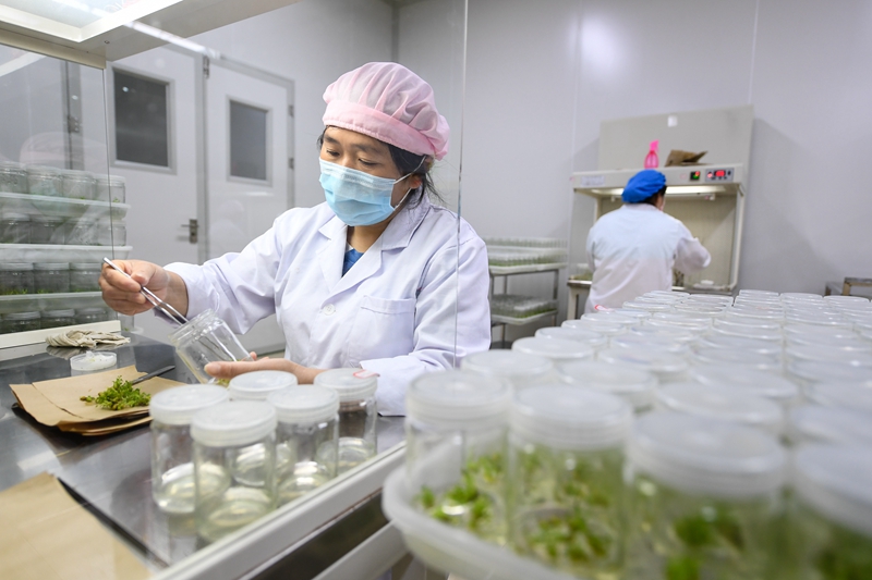 6月19日,在位于泗阳县来安街道的江苏新境界花卉基地植物组培繁育中心,工人在进行幼苗接种。