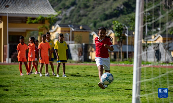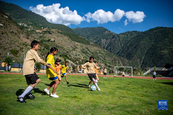 云南省怒江傈僳族自治州泸水市大兴地镇格力小学学生在球场上踢足球(2020年5月18日摄)。新华社记者 江文耀 摄