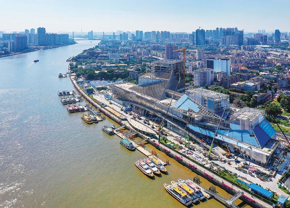 ▲广东美术馆、广东非物质文化遗产展示中心、广东文学馆“三馆合一”建筑长350米,高近80米,宛如一艘“文化巨轮”扬帆珠江(10月12日摄,无人机照片)。新华社记者刘大伟摄