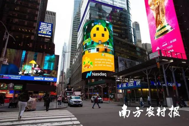 11月底,广东柑橘集体亮相纳斯达克大屏,闪耀美国时代广场。广东特色优势农业品牌宣传推介暨品牌运营项目正式开启国际化之旅。
