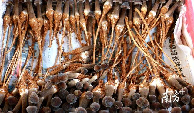 近日,在韶关曲江区沙溪镇窝子村委食用菌种植基地,走进菌菇大棚,只见黑褐色的鸡枞菌破土出菇,簇拥而生,农户们正忙着采摘新鲜的黑皮鸡枞菌菇。