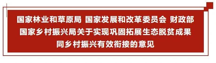 近日,国家林业和草原局、国家发展和改革委员会、财政部、国家乡村振兴局联合印发《关于实现巩固拓展生态脱贫成果同乡村振兴有效衔接的意见》,积极贯彻落实《中共中央 国务院关于实现巩固拓展脱贫攻坚成果同乡村振兴有效衔接的意见》,巩固拓展生态脱贫成果,促进乡村振兴。