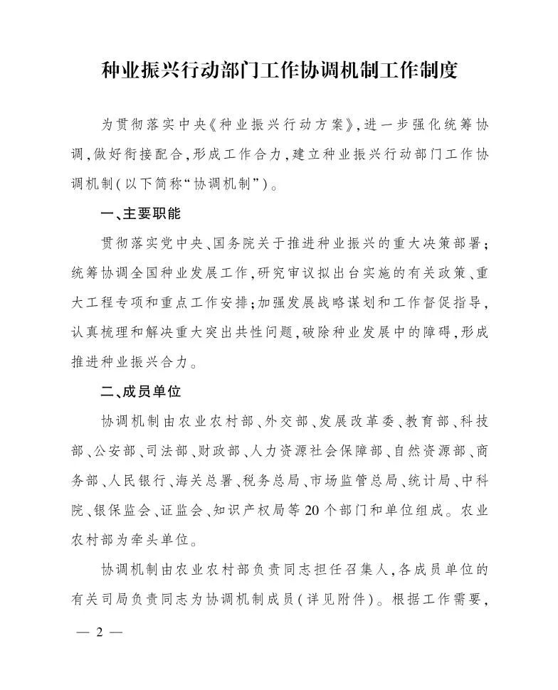 根据《种业振兴行动方案》有关要求,农业农村部牵头,经商各有关部门、单位同意,制定了《种业振兴行动部门工作协调机制工作制度》,现予以印发。